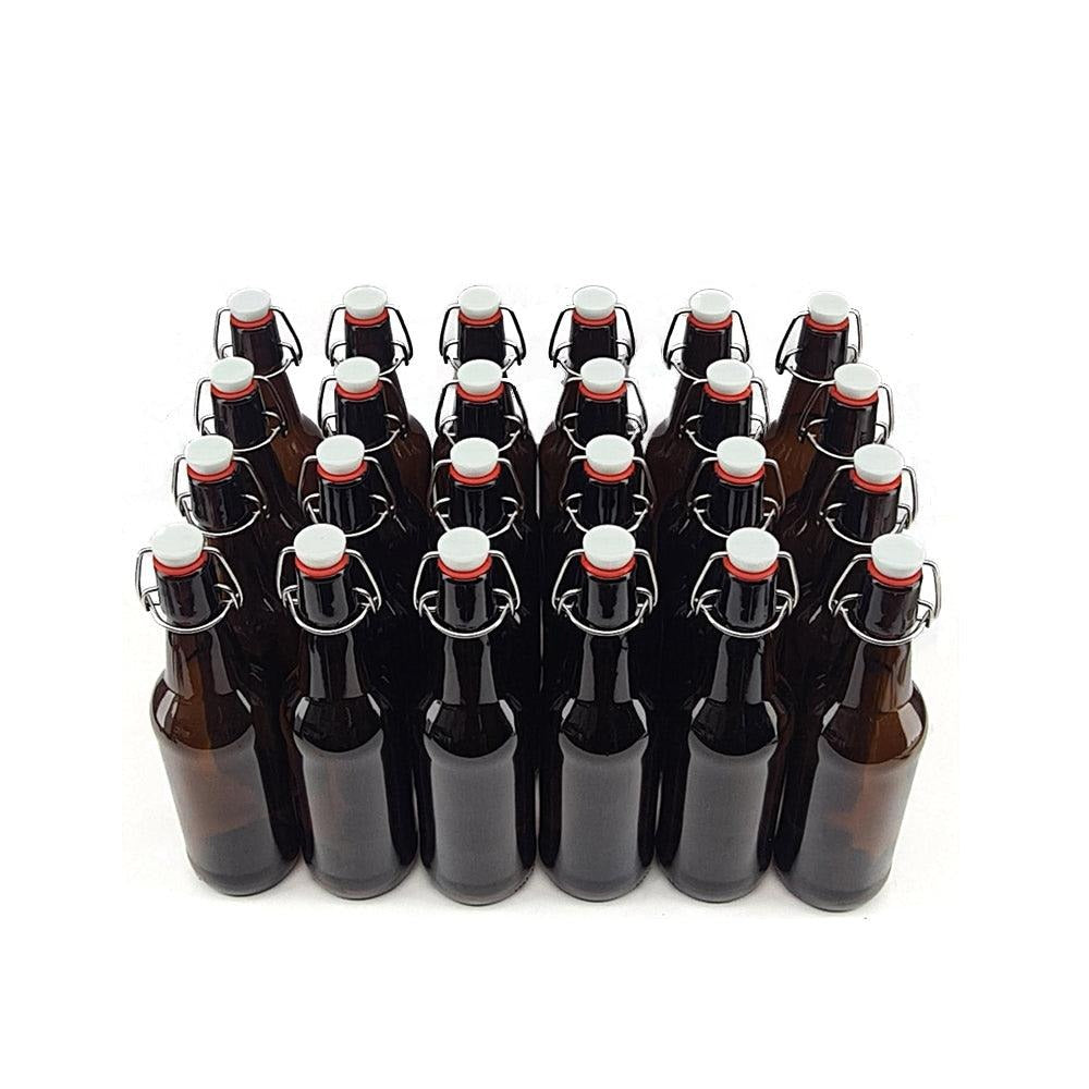 - 24 Food Grade Amber Glass bottles, with silicone seal and PP swing top cap.