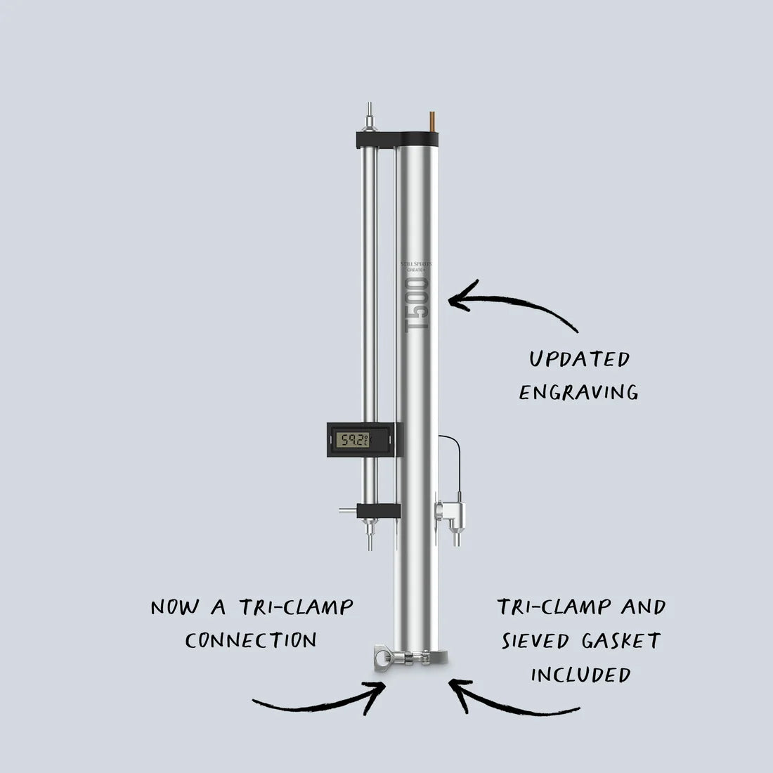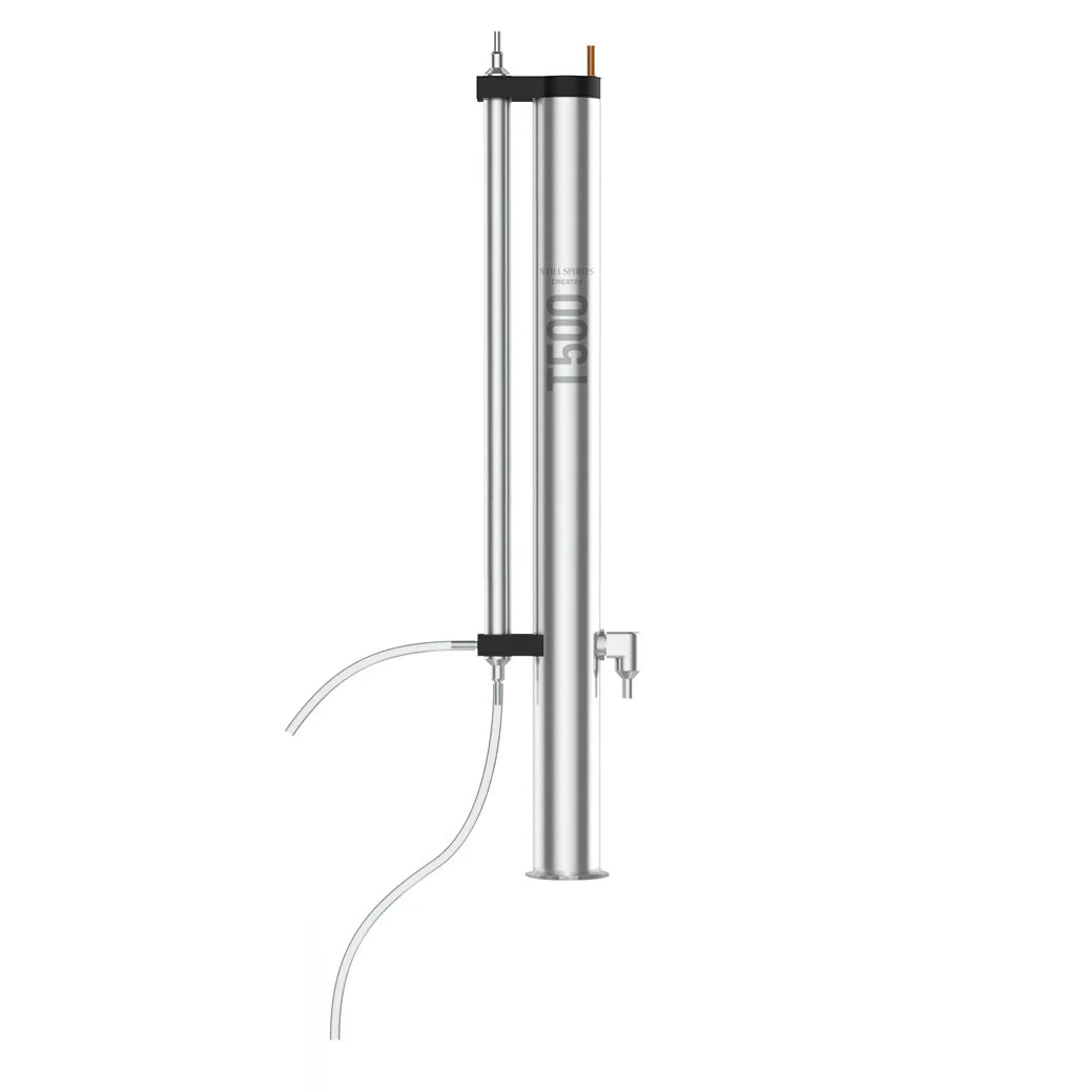 Its 2" tri-clamp connection allows for it to be connected to 2" tri-clamp accessories, so your customers have the option to experiment with different setups and attachments. The T500 features a cutting-edge design that incorporates pre-packed copper and stainless-steel saddles. This innovative amalgamation ensures optimal vapour reflux, facilitating the production of superior-quality distillate. Ideal for both novice and experienced distillers, the T500 redefines convenience in home distillation, delivering unmatched results with a seamless blend of form and function.