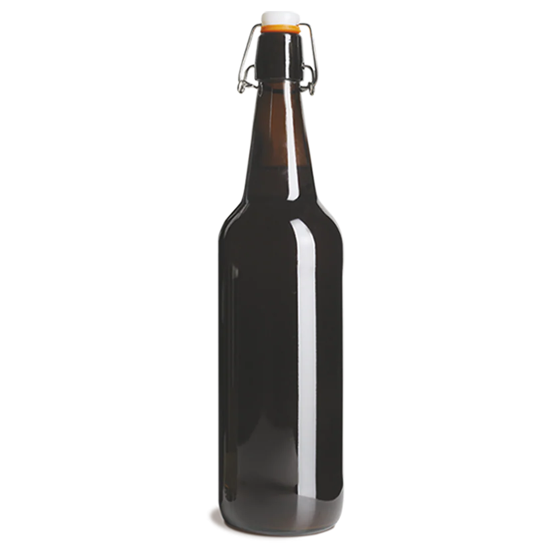 A case of 12 x 750 ml amber glass flip top bottles for bottling beer, cider, or seltzer. Amber in colour to protect the beer from light, this convenient size bottle holds the perfect amount for two glasses.